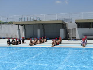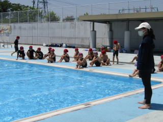 真っ青に澄み渡る空、赤い水泳帽をかぶった2年生の子どもたちがプールサイドに集まりました。マスクを外しているため、みんな無言です。