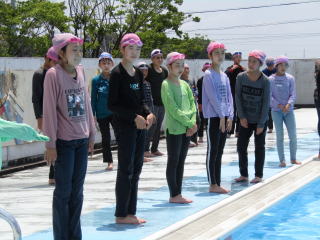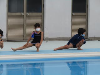 無言でプールサイドに集まり、マスクをしたまましっかりと準備運動。