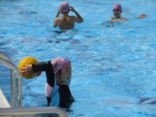 その後は、水中バレーボールを楽しみました。声は出せないため、静かに満面の笑顔でボールのパスを続けました。 |
