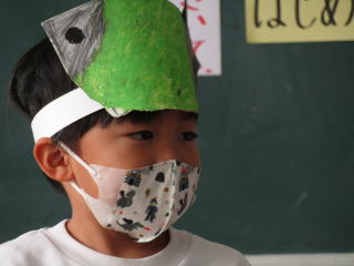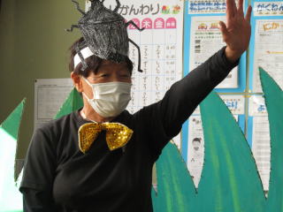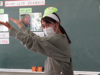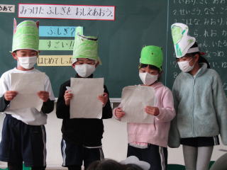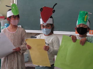 | 1年生で生活科の研究授業が行われました。今日は「むしむしはっぴょうかい!」。自分で作ったお面を被り、クイズ形式や寸劇で「むし」のひみつをグループ発表しました。発表が終わった後には、@不思議に思ったことAすごいと思ったことB初めて知ったこと を発表を見ている子どもたちが発表し、全体で共有しました。 |