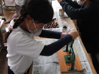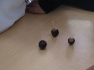 「あきとあそぼう!」1年生の生活科の授業の1コマです。ドングリに穴を開け、つまようじを刺して「ドングリゴマ」を作りました。穴を開ける時、力の入れ方が難しくて、少し時間がかかりますが、みんな大成功!