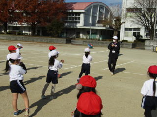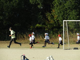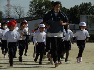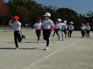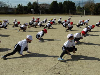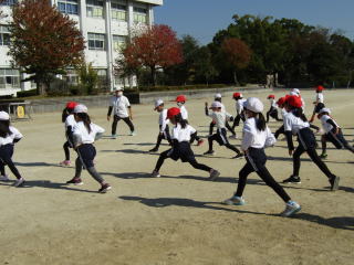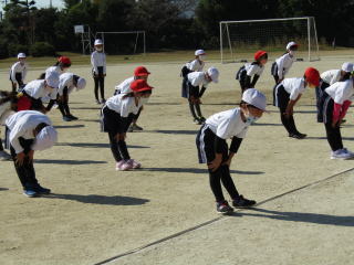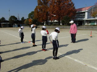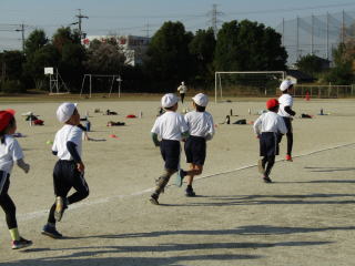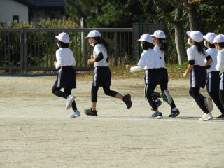 朝はかなり冷え込んできたものの、日中は暖かくなります。今日も、体育科の授業の始まりにかけ足練習をします。かけ足をする前に準備運動を入念にします。そして、先生から注意事項を聞き、くつひもと身なりを再確認。いよいよスタートします。1周目は担任の先生が先導し、ゆっくりのペースで走ります。