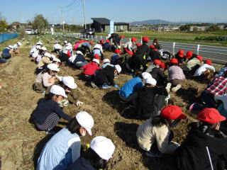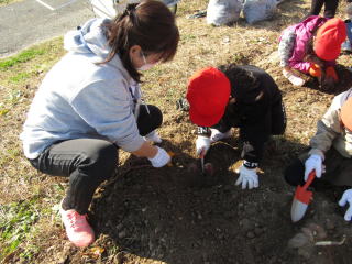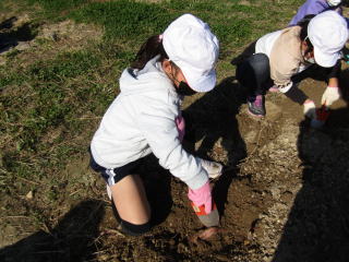 1・2年生の子どもたちが待ちに待った芋ほりの日がやってきました。さんさんの郷の農園にお借りした芋畑。真っ青な空の下、スコップを手にした子どもたちが一斉に目の前の土を掘り始めます。瞬く間に大きなお芋が現れて・・・でも、お芋はなかなか手強いのでとれません。