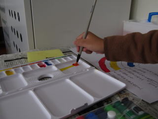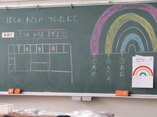 1年生の子どもたちがに絵の具を使って虹をえがきました。真っ白なパレットに少しずつ赤・青・黄の絵の具を出します。そして、次に黄と赤を混ぜます。混ぜる時には、その都度、丁寧に筆を洗い、元の色に混ざらないように気をつけます。