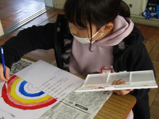 先生のお話をしっかり聞きながら、1色ずつ色を塗っていきます。大切に描いた自分だけの「虹」。どの子どもも晴れやかな表情をしていました。 |