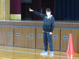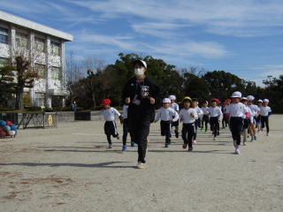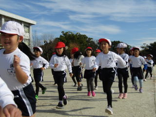 今朝はかなり冷え込みました。少しずつ寒さが和らいだ3時間目、体育科の授業の始まりにかけ足練習をします。かけ足をする前にしっかりと準備運動をします。そして、くつひもと身なりを整えて、スタート。1周目は担任の先生が先導し、無理のないゆっくりのペースで走ります。