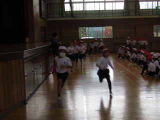 1周目は先生を先頭に、ゆっくりのペースで走ります。2周目からは自分のペースを保って走り続けます。一生懸命に走る子どもたちの姿は実に清々しいものがあります。 |