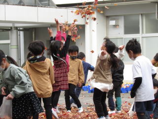 木の葉を両手いっぱいにすくい、空高く舞い上げる子どもたちの声は弾みます。 |