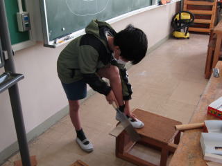 4年生の図工科では、木材を加工して自分だけのオリジナル動物を作成しています。木片に印をつけ、のこぎりで丁寧に切ります。最初のうちは慣れない手つきでしたが、少しずつ思い通りにのこぎりを扱うことができるようになりました。