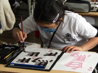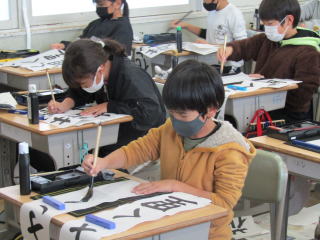 冬休み明けすぐに予定されている書き初め大会に向けて、練習しています。4年生は「花さく里」の4文字にチャレンジです。