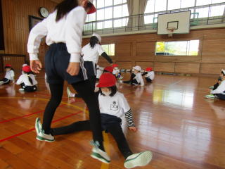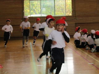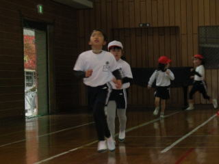 あいにくの雨模様のため、体育館の周回コースを走ります。前回よりも走る姿が大きくダイナミックになりました。走った後の整理運動やストレッチも入念に行いました。 |