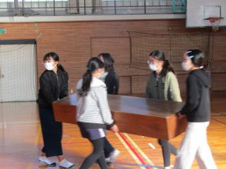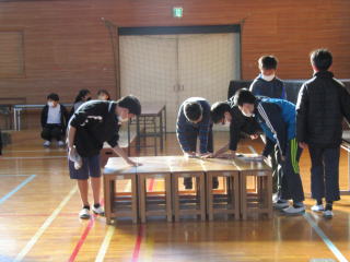 全校児童の作品を展示するスペースをつくるために、6年生が代表で1時間目から長机やようかん台、椅子を体育館に運び入れ、学年ごとのベースを設置しました。