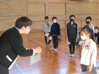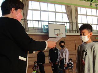 集会では、まず先日行われた校内マラソン大会の入賞児童の表彰を校長先生にしていただきました。その後、校長先生からは成長した子どもたちへの温かいメッセージが話されました。 |