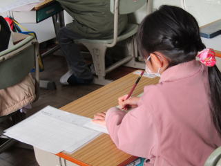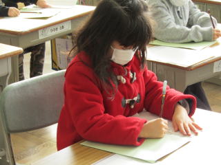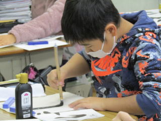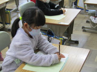 | 本日の1・2時間目は校内書き初め大会でした。1・2年生は硬筆、3年生以上は毛筆で、これまでの練習の成果を出し切ろうと集中して取り組む姿がありました。どの子どもも背筋を伸ばし、お手本を何度もしっかり見ながら、筆を動かしていました。 |