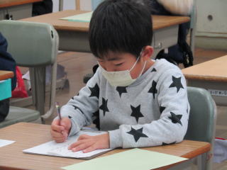 来週の火曜日は書き初め大会です。本番へ向けて、1年生の子どもたちは集中して練習します。お手本を見ながら、鉛筆を握る手に力が入ります。 |