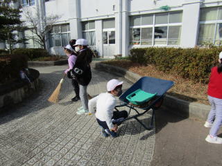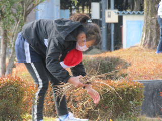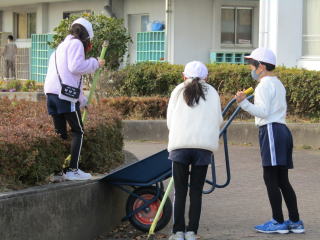 | 寒風吹きすさぶ校庭で、子どもたちが、一生懸命に動きます。木の元にたまった落ち葉や小枝をきれいにします。清掃の時間、子どもたちは時間いっぱいまで動きます。毎日、気持ちよく清掃する子どもたち。その姿を見ていると心が洗われます。 |
