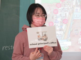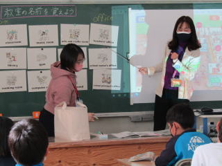 | 4年生の外国語の授業の1コマです。めあては「教室の名前を覚えよう」です。学校の様々な教室の名前を英語で発音します。また、「room」と「office」の使い分けについても学習しました。テキストの巻末に付属されたカードを各自で切り取り、教室の名前でビンゴゲームをするなどして、積極的に学ぶ姿がありました。 |