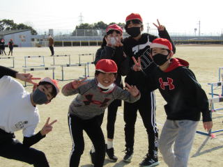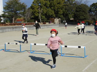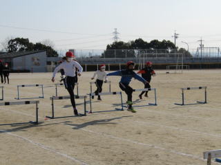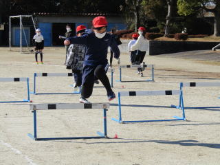 | 冷たい風が吹く中、4年生の子どもたちはハードル走にチャレンジです。準備運動の後、運動場を1周し体を温め、練習に臨みます。何度も試走を繰り返す中で、自分に合うインターバルを見つけました。リズムよくハードルを跳び越し、できる限りスピードが落ちないようにします。子どもたちは一心不乱に何度もチャレンジし、自己記録の更新を目指しました。 |