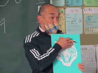今日は、いよいよ彫刻刀を使って版を彫る学習です。事前に彫刻刀の種類や使い方、安全面での注意事項など動画を活用して詳細な説明がありました。