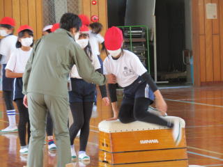 4年生は体育科の授業で閉脚跳び(跳び箱)にチャレンジしています。