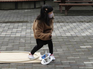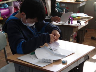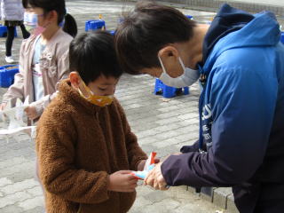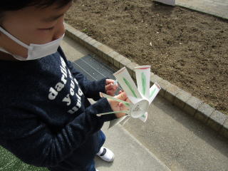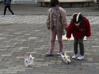 | 寒さ厳しい中庭。1年生の子どもたちは元気に駆け回ります。生活科の授業の1コマです。自分で作った「かざわ」「風車」「紙ひこうき」を手に持って、その動きを確かめます。風が吹く方向を何度も確かめながら「かざわ」を転がします。空高く舞い上がる紙ひこうきに満面の笑みがこぼれます。 |
