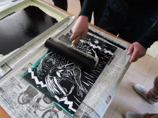これまで彫刻刀で作業を進めてきた版が、ようやく完成!いよいよ今日はインクをつけて紙に刷ります。