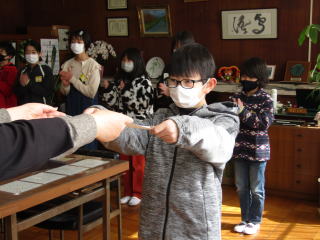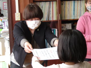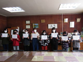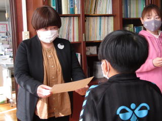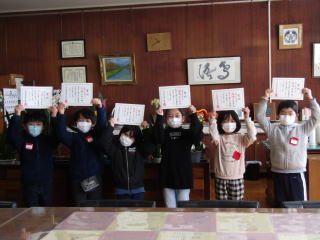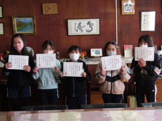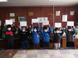本日の南小タイム、校長室において1月に行われた書き初め大会の表彰がありました。校長先生より一人ずつ賞状が手渡されました。2・5年生の入賞した児童は、立派な返事と動きで賞状を受け取りました。