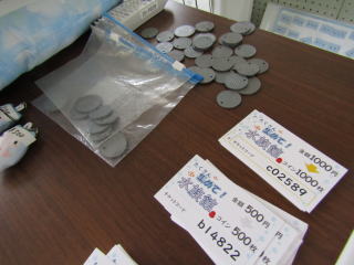 現金に見立てたプラスチックの硬貨とコード決済用のチケット(架空)を子どもたちは手にし、コード決済の便利な点と注意点について考えました。 |