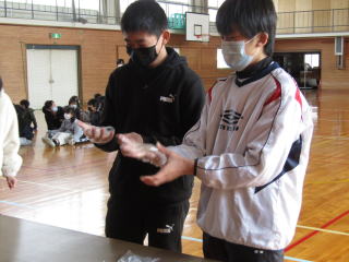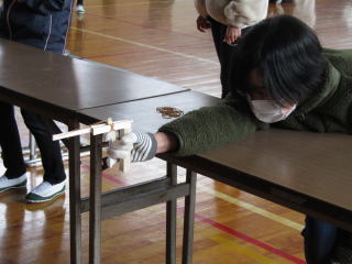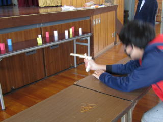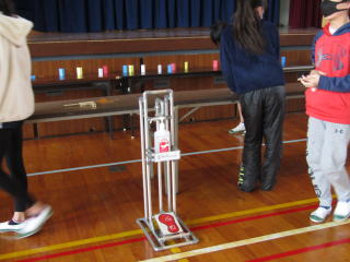 今日は5年生との交流です。内容は「的当てゲーム」。割りばしでつくった鉄砲で的をねらい、得点を競います。広い体育館を会場にし、手指消毒液を置いて、手には手袋やビニル手袋をつけての交流をしました。 |