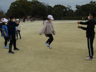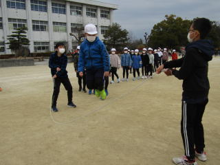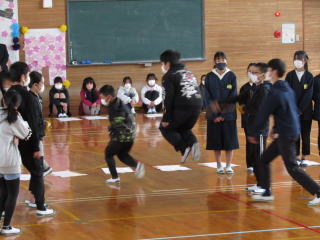体育委員会が主催して大縄跳び(8の字跳び)にチャレンジです。日頃の練習の成果が十分に発揮され、子どもたちはテンポよく大縄に入ります。
