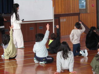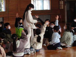 体育館に集まった3年生とともに、南部小学校の先生方に関するクイズ大会を楽しみました。