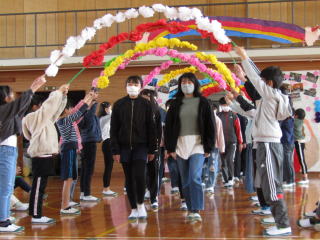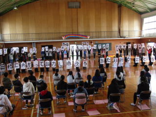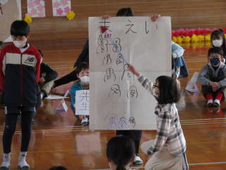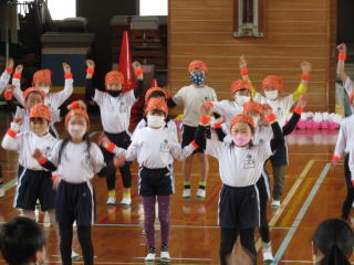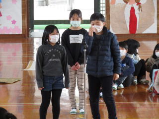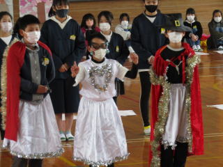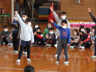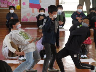 3・4時間目、体育館において卒業を祝う会がありました。これまでお世話になった6年生へ、各学年からのプレゼント(出し物)がありました。