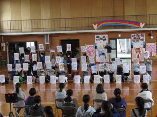 本来であれば、全校が体育館で集まり、6年生との交流を深めたいところですが、感染症対策として、発表学年と6年生のみが体育館で交流する方法で進めました。出番以外の時間はオンライン(ZOOM配信)で他学年の発表の様子を見て、楽しむ時間となりました。 |