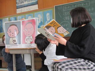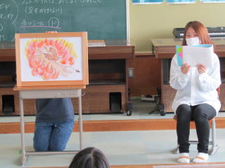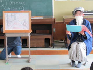 大型絵本の読み聞かせに始まり、文詩集みよしから抜粋した作品の朗読、国語の教科書から・・・3年「サーカスのライオン」、2年「ニャーゴ」、1年「大きなかぶ」、5年「ごんぎつね」の一場面の読み聞かせをしていただきました。