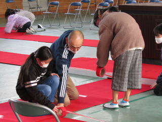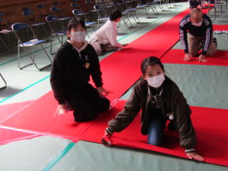 絨毯に汚れがつかないように配慮し、体育館シューズを脱いで作業しました。すっかり、会場は整い、これで6年生が気持ちよく卒業式練習ができます。 |