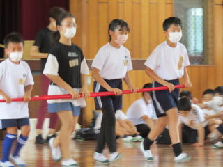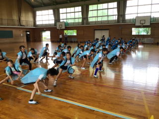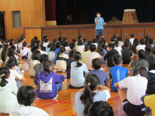 1時間目、全校児童が体育館に集まり、プール開き集会がありました。体育主任の先生よりプールを使用するする際の注意事項のお話がありました。その後、ステージ上に設置した跳び箱を「プールサイド」に見立てた、入水時のポイントについて説明がありました。今回、全校のためにプール清掃をした6年生へ対し、1〜5年生までの子どもたちが感謝の気持ちを込めてお礼を伝える場面もありました。