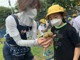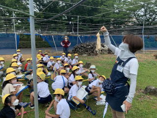 | 3年生の子どもたちは、学区にある梨の栽培園へ行きました。実際に梨を栽培されている農家さんの話を聞き、梨作りの1年の様子を知るとともに、事前に考えておいた質問をする中で美味しい梨を作るための工夫や努力を知る貴重な機会となりました。 |