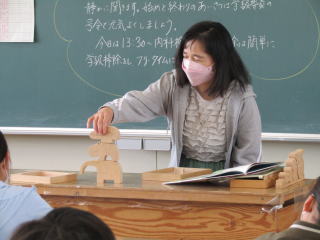 絵本を実物投影機で大きく映したり、積み木を使ったり・・・様々な工夫があり、子どもたちは興味津々。