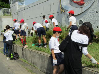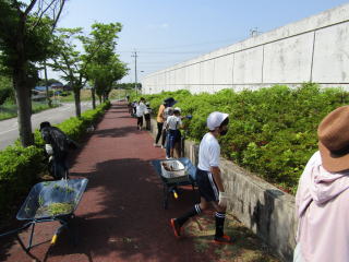 本日の1・2時間目、5年生の保護者と子どもたちによる「親子勤労」が行われました。環境部長からのあいさつの後、それぞれの学級ごとに割り当てられた場所へ移動し、活動開始。植え込みの間から伸びる雑草を丁寧に一本ずつ抜いていきます。また、環境部の皆さんには草刈機を使って、学校北側の歩道脇の雑草を刈り取っていただきました。