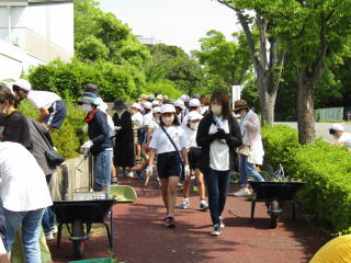 約1時間の活動後、環境副部長からのあいさつで全ての取り組みが終了となりました。学校敷地東側および南側の植え込みは、みちがえるようにきれいになりました。ありがとうございました。 |