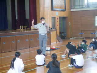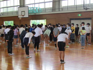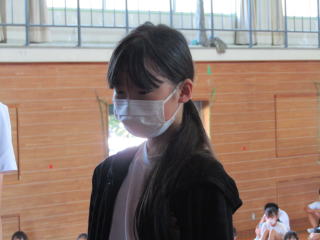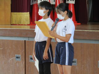月に一度の朝会がありました。全校児童が体育館に集まり、児童会役員の司会で朝会が始まります。