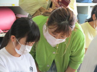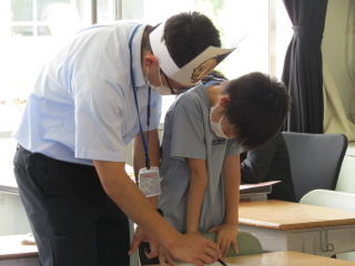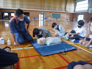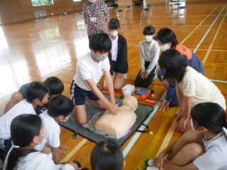 実習用の人形および訓練用のAEDを使用し、救急救命の方法についてレクチャーを受け、一人ずつその動きを体験しました。