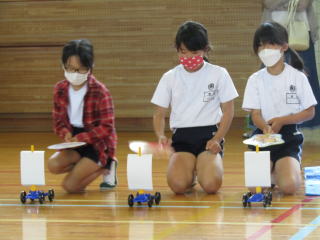 体育館では、3年生がうちわで風を送り、自作の車を走らせます。4年生では、白衣で身を包む先生が実験する様子を見せます。6年生は、キャリア教育の一環で参観いただいた保護者に子どもたちが職業に関する質問をします。