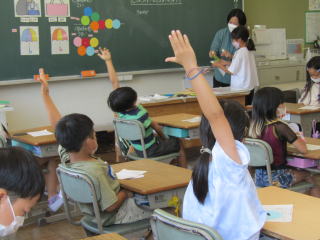 2年生の教室で研究授業が行われました。題材は「じぶんやみんなをたいせつにしよう」。子どもたちにとってなじみのある「色」を取り上げ、「自分らしさ」を考えるきっかけにしました。また、自分の好きな色を理由とともに紹介し合う活動を通して、性別に関係なくいろいろな考え方があることを知る機会にもなりました。 |