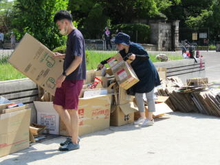 朝9時より本年度の1回目となる資源回収を行いました。真夏の日差しが照り付ける中、6年生の子どもたちと2・6年生の保護者の皆さんが、額に汗を流しながら運び込まれる紙類の仕分けをしました。回収作業は1時間ほどで終わりました。