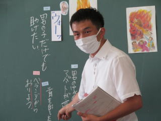 | 3年生の教室で国語科の研究授業がありました。単元名は「サーカスのライオン」。本時では、第4場面でライオンのじんざが男の子を火事の中から救い出したときの気持ちを考えました。子どもたちは、じんざの気持ちをとらえた言葉を教科書の文面から選び出し、自分なりの思いをまとめます。級友との話し合い活動を通して、じんざの気持ちの変容を読み取っていこうとする姿が見事でした。 |