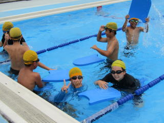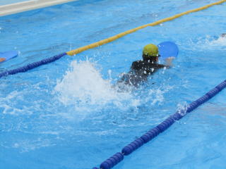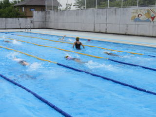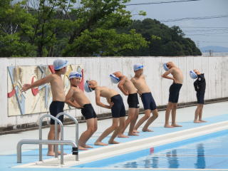 | 夏本番の暑さが続いています。朝から夏空が広がっています。プールサイドでは、水着の子どもたちが静かに活動しています。それぞれが決めた学習課題に向けて、黙々と泳ぎます。プールサイドに賑やかな声はありませんが、白い水しぶきが気持ちよく上がります。 |