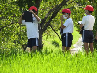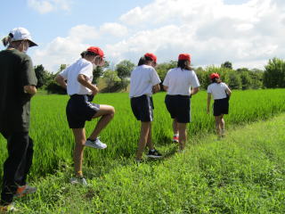 よく降った雨も上がり、夏空が広がる朝、5年生の子どもたちは学校の北側にある田んぼへ出かけました。