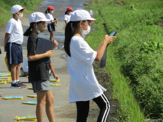 5月に田植えをした苗の生長を確かめるためです。真っ青に伸びる長い葉が勢いを感じます。子どもたちは、それぞれにタブレットでその様子を撮影し、間近でゆっくりと観察しました。 |
