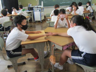 「ともだちのいいところみつけ」や2つのチームに分かれてのデイベート、「アドじゃん」等に取り組みました。話す相手にしっかりと顔を向け、聴く姿勢を大事にしています。 |